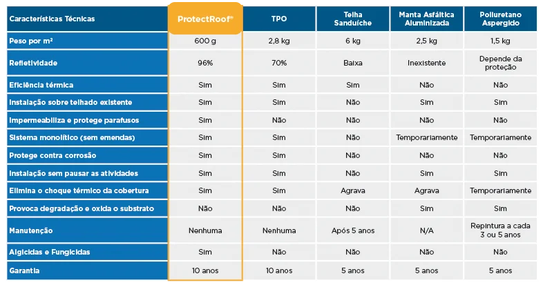 Proteção Completa: O sistema ProtectRoof oferece uma proteção completa contra uma variedade de patologias, incluindo infiltrações de água, corrosão e danos térmicos, garantindo a integridade da cobertura metálica ao longo do tempo.